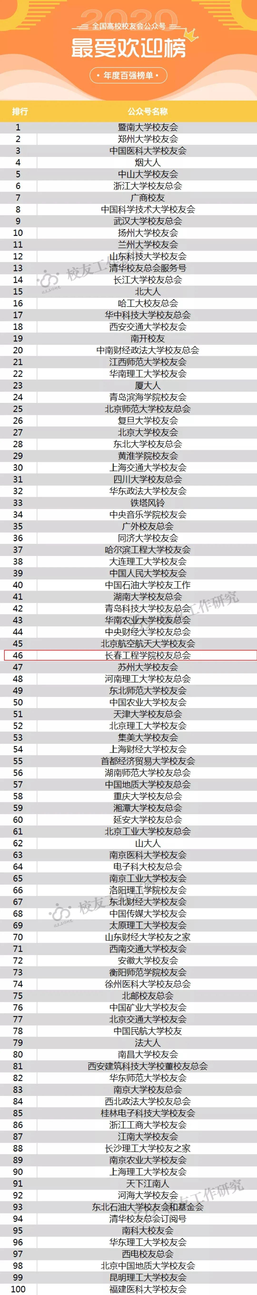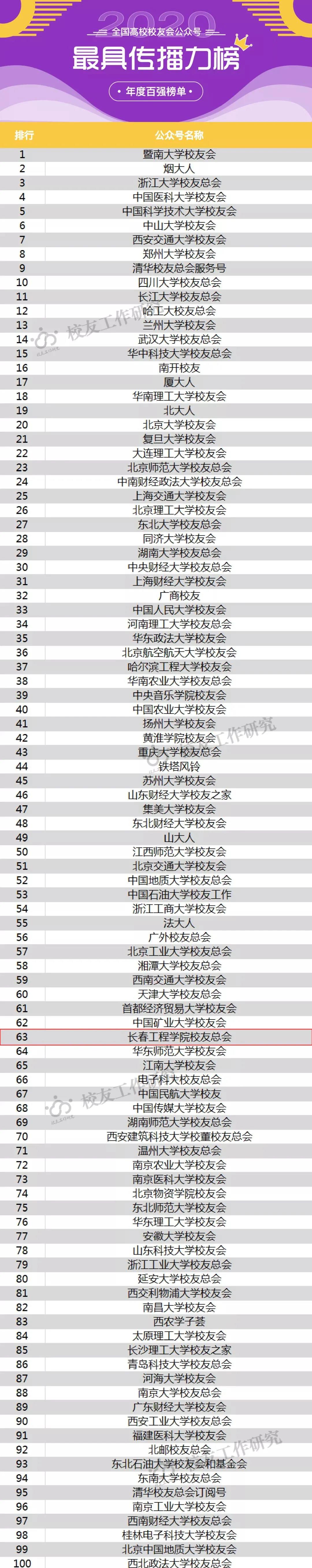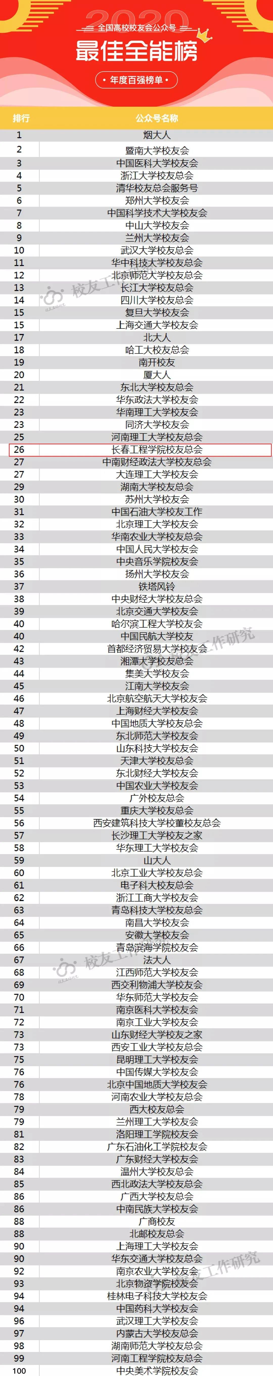 2月5日,“校友工作研究”发布了《全国高校校友会微信公众号2020年度百强榜单》,“乐鱼官网网页版_乐鱼(中国)官方校友总会”分别位列“最佳全能榜”第26位、“最受欢迎榜”第46位、“最具传播力榜”第63位,以上三个榜单均比上一年度有所提升,其中代表综合成绩的“最佳全能榜”已连续三年位列吉林省第1位。该榜单是基于“校友工作研究”收集的全国400多个高校校友会公众号样本库产生。