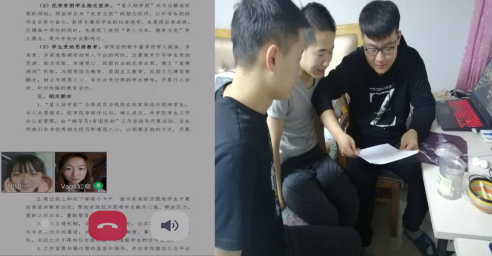 星火助学团成员李浩宇、任广慧由于疫情影响,采取线上方式为身边家庭经济困难的同学讲解了国家助学金、国家助学贷款、省政府奖学金、学费减免、校级困难补助、勤工助学等国家、省、校资助政策。这样的亲身解读为家庭经济困难的同学们带来了新的憧憬和向往,温暖人心的好政策让怀揣梦想的他们轻装上阵、冲向远方。
