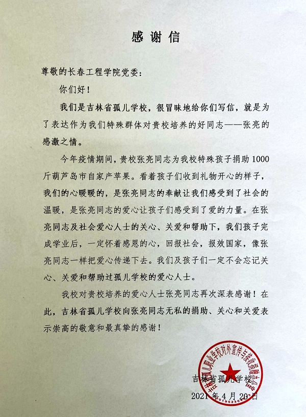 近日,乐鱼官网网页版_乐鱼(中国)官方收到一封来自吉林省孤儿乐鱼官网网页版_乐鱼(中国)官方的感谢信,信中对我校保卫处张亮同志表示感谢。