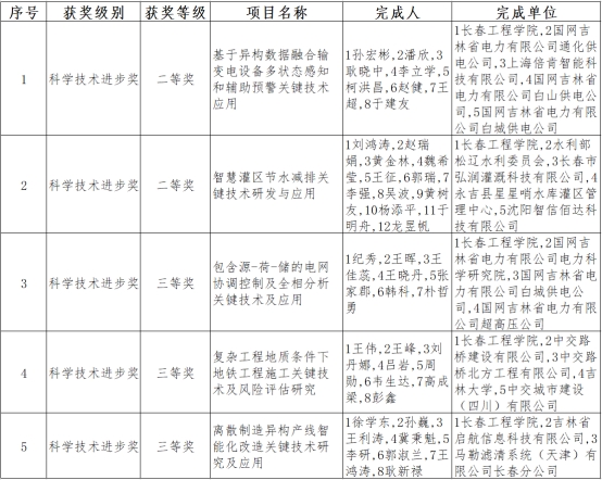 日前,吉林省人民政府下发《乐鱼官网网页版_乐鱼(中国)官方2022年度吉林省科学技术奖励的决定》(吉政函2022[66]号)。我校共有5项科技成果获奖。其中,二等奖2项,三等奖3项。我校计算机技术与工程学院孙宏彬教授申报的项目“基于异构数据融合输变电设备多状态感知和辅助预警关键技术应用”与水利与环境工程学院刘鸿涛教授申报的项目“智慧灌区节水减排关键技术研发与应用”分别获得科学技术进步二等奖。具体获奖名单详见附表。