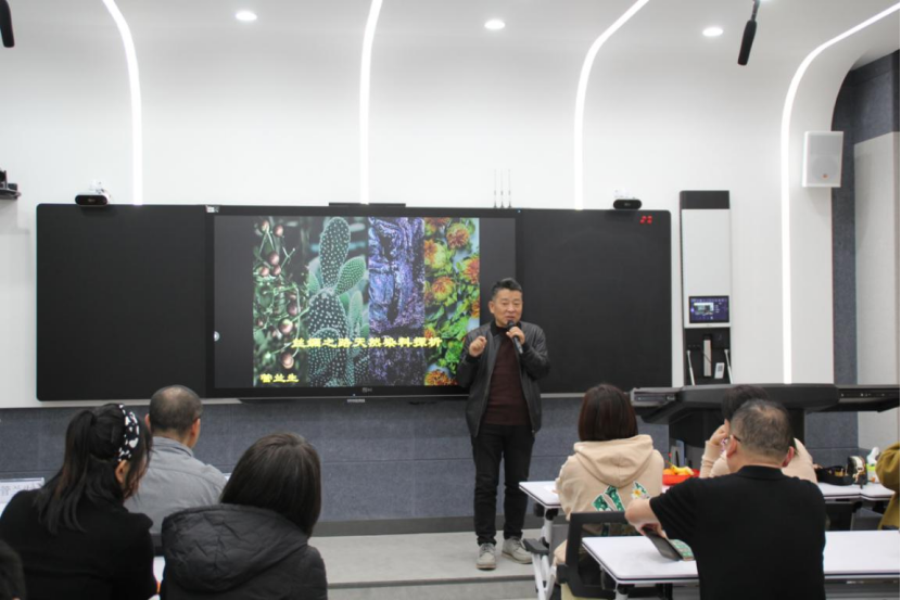 管兰生教授以“丝绸之路染缬艺术的传承与创新”为主题,讲授了传统染缬艺术的“染”和“缬”的传统技艺及方法,并展示了传统染缬的创新应用成果,服装服饰设计专业学生聆听的同时动手实操,感受中华传统技艺的魅力。曹建中教授以“基于设计学科的民族服饰田野调查实践”为主题,分析解读了中国少数民族的形成、民族服饰文化的特色及田野调查的“看、试、记、整”方法。两位教授还与师生们分享了非遗项目的选题凝练与研究路径、实践方法与成果转化等经验和心得,传递了非遗技艺的温度与非遗传承人的热忱,令广大师生受益匪浅。