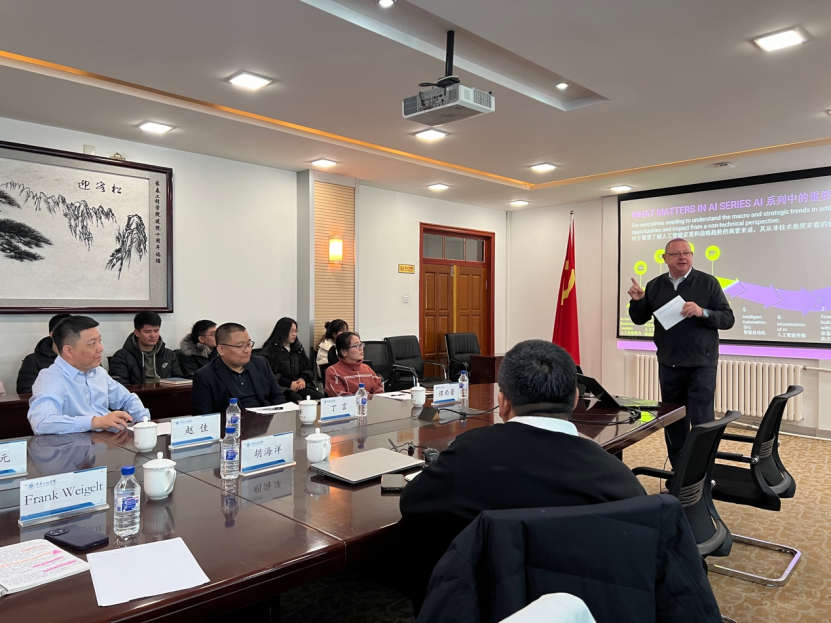Frank Weigelt 工程师先是介绍了人工智能系列主题中的重点内容,他认为我们正在步入智能自动化生产的道路,对于需要了解人工智能宏观及战略趋势的高级管理人员,要从非技术角度来看待机会和影响。随后同参与的师生一起讨论了生成式人工智能对内容创作、信息检索、成本控制等领域的不同影响和发展机会。人工智能的优势是能够更快地获取信息,更加准确地进行分析,使我们能够提高整体生产力。他认为人工智能的发展将对医疗、金融、制造业及零售业产生深远影响。