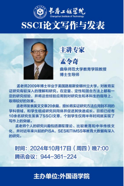 2024年10月17日晚七点,外国语学院成功举办了题为《SSCI论文写作与发表》的学术报告,会议以线上形式举行。此次报告吸引了来自全国多所院校的教师及外国语学院教师共计八十余人参会。外国语学院楚永娟院长、杨晖副院长出席了本次活动,活动由负责科研工作的副院长孙薇娜主持。