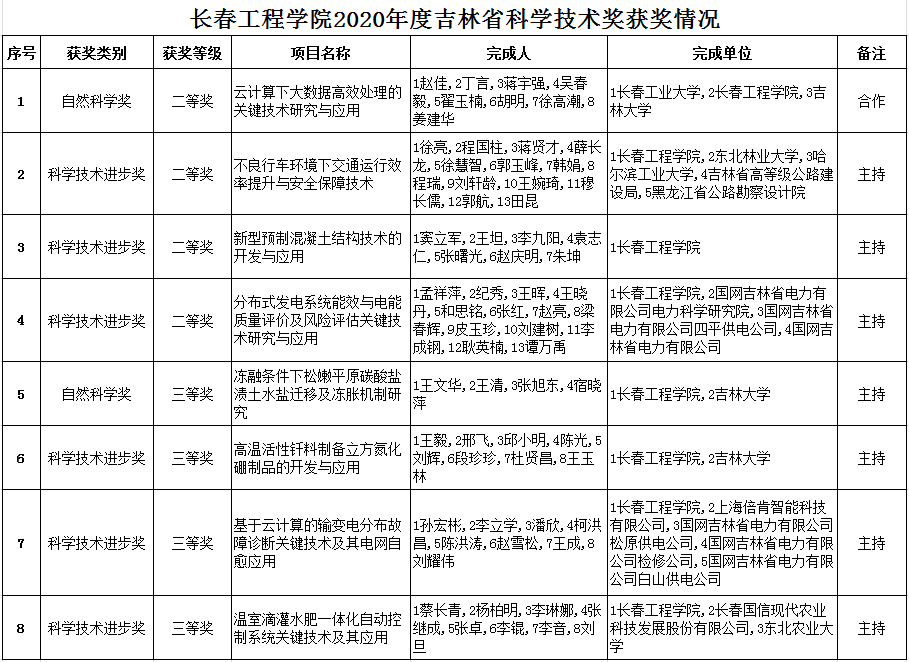 日前,吉林省科技厅公布了《乐鱼官网网页版_乐鱼(中国)官方2020年度吉林省科学技术奖励的决定》。我校共有8项科技成果获奖,其中,二等奖4项,三等奖4项,获奖数量与层次再创新高。我校孟祥萍副校长申报的项目“分布式发电系统能效与电能质量评价及风险评估关键技术研究与应用”、窦立军副校长申报的项目“新型预制混凝土结构技术的开发与应用”及土木工程学院徐亮教授申报的项目“不良行车环境下交通运行效率提升与安全保障技术”分别获得科技进步二等奖;计算机技术与工程学院赵佳教授与其他单位合作申报的论文“云计算下大数据高效处理的关键技术研究与应用”获得自然科学二等奖。具体获奖名单详见附表。