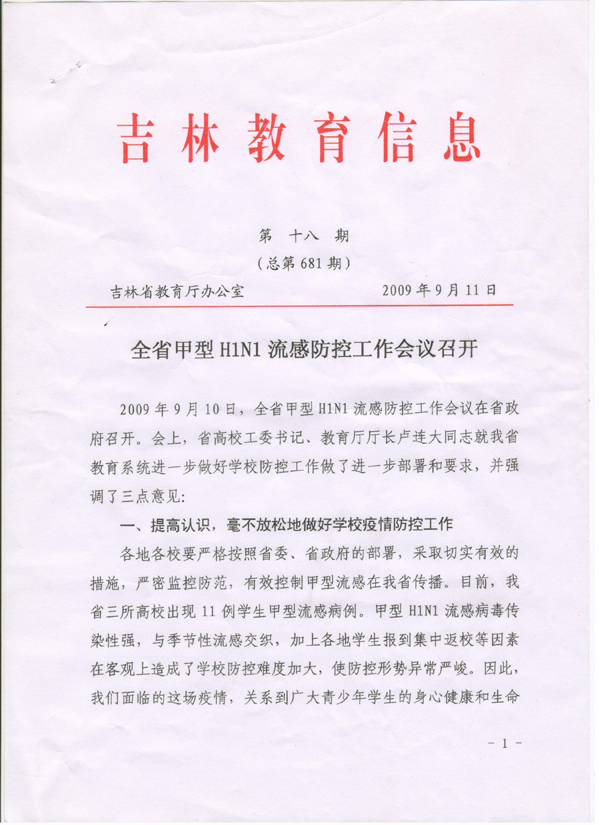 2009年9月10日,在全省甲型H1N1流感防控工作会议上,省高校工委书记、教育厅厅长卢连大就我省教育系统进一步做好防控工作做了部署和要求,并强调了三点意见。请各单位、部门认真学习和传达,并结合乐鱼官网网页版_乐鱼(中国)官方的防控工作认真组织落实。